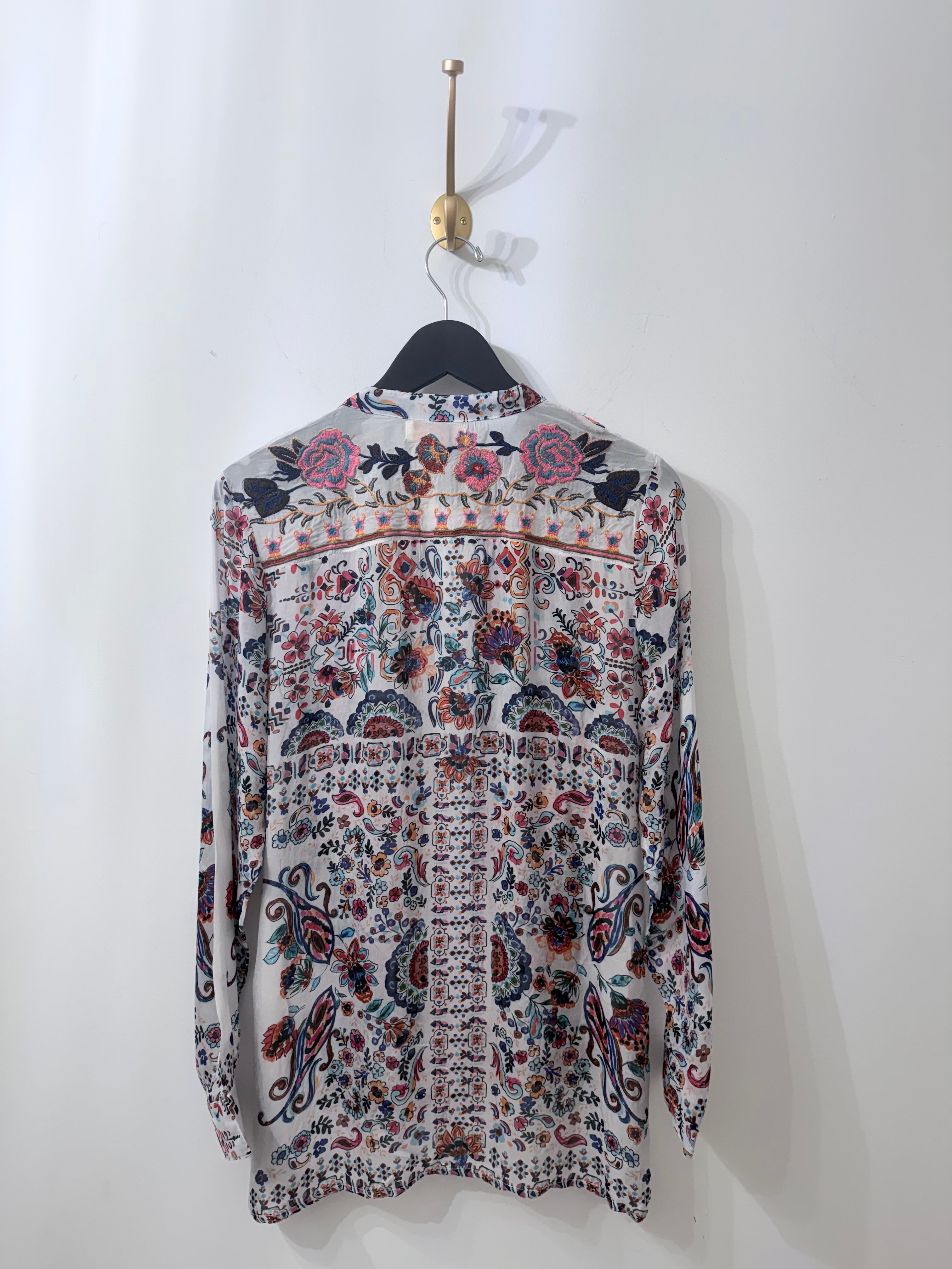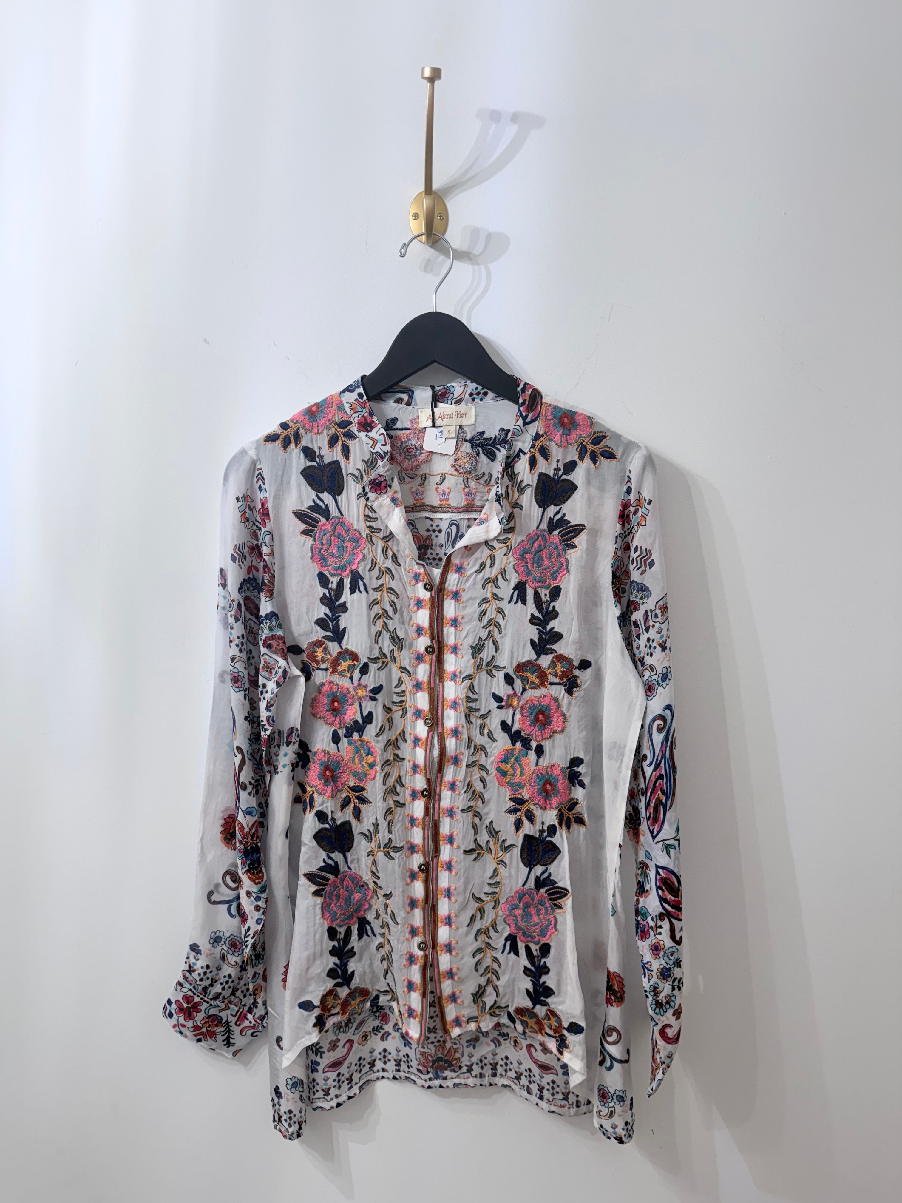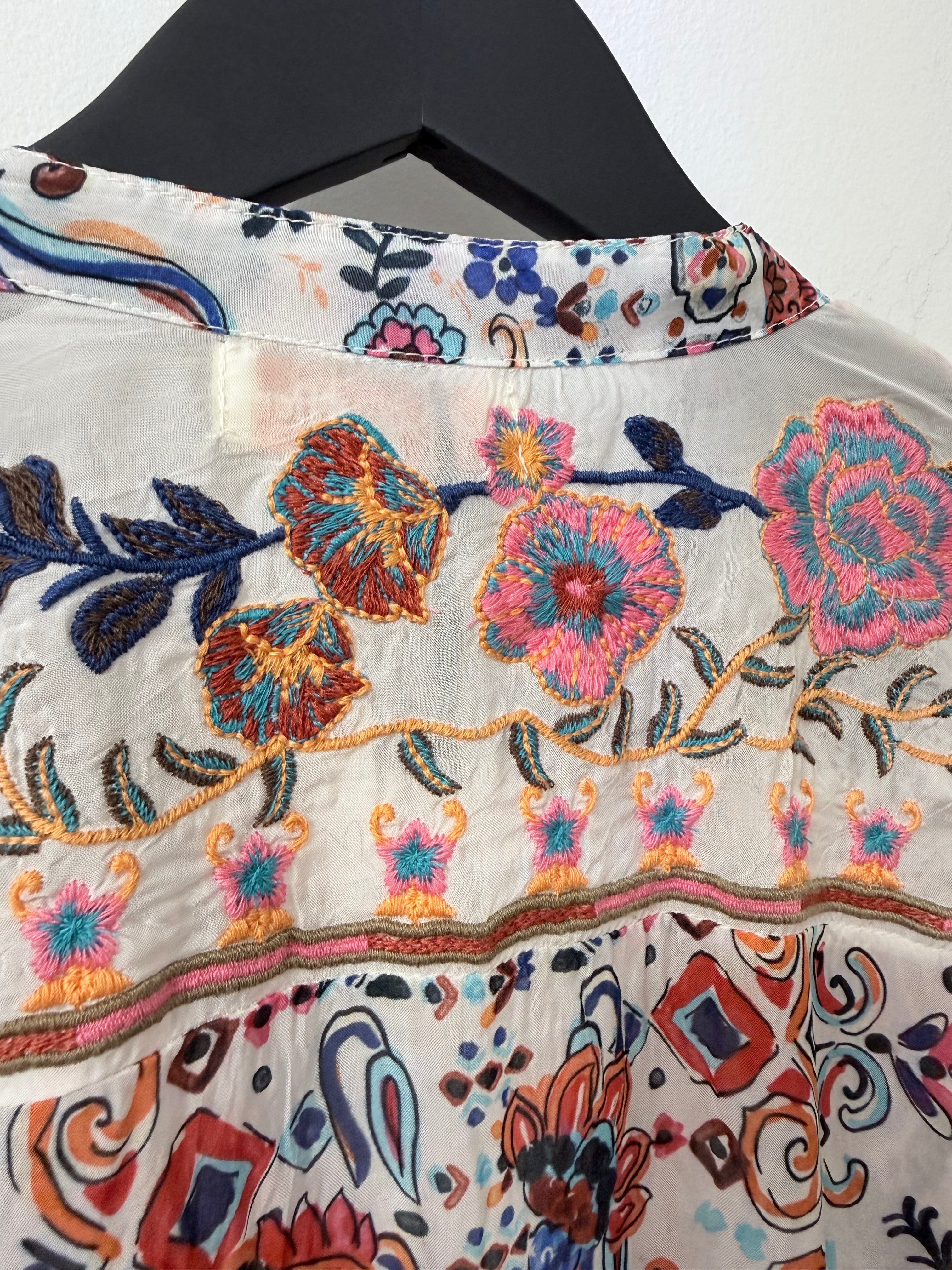 Escape to coastal bliss in this white and blue, floral viscose embroidered shirt — your new vacation essential. Crafted with charming floral-inspired details, she's designed for lazy beach days and waterfront wandering. Pair her with your favorite tank and shorts for effortless beachside style that feels as good as it looks. Whether you're strolling the boardwalk or settling in for sunset, this top brings relaxed elegance to every getaway moment.