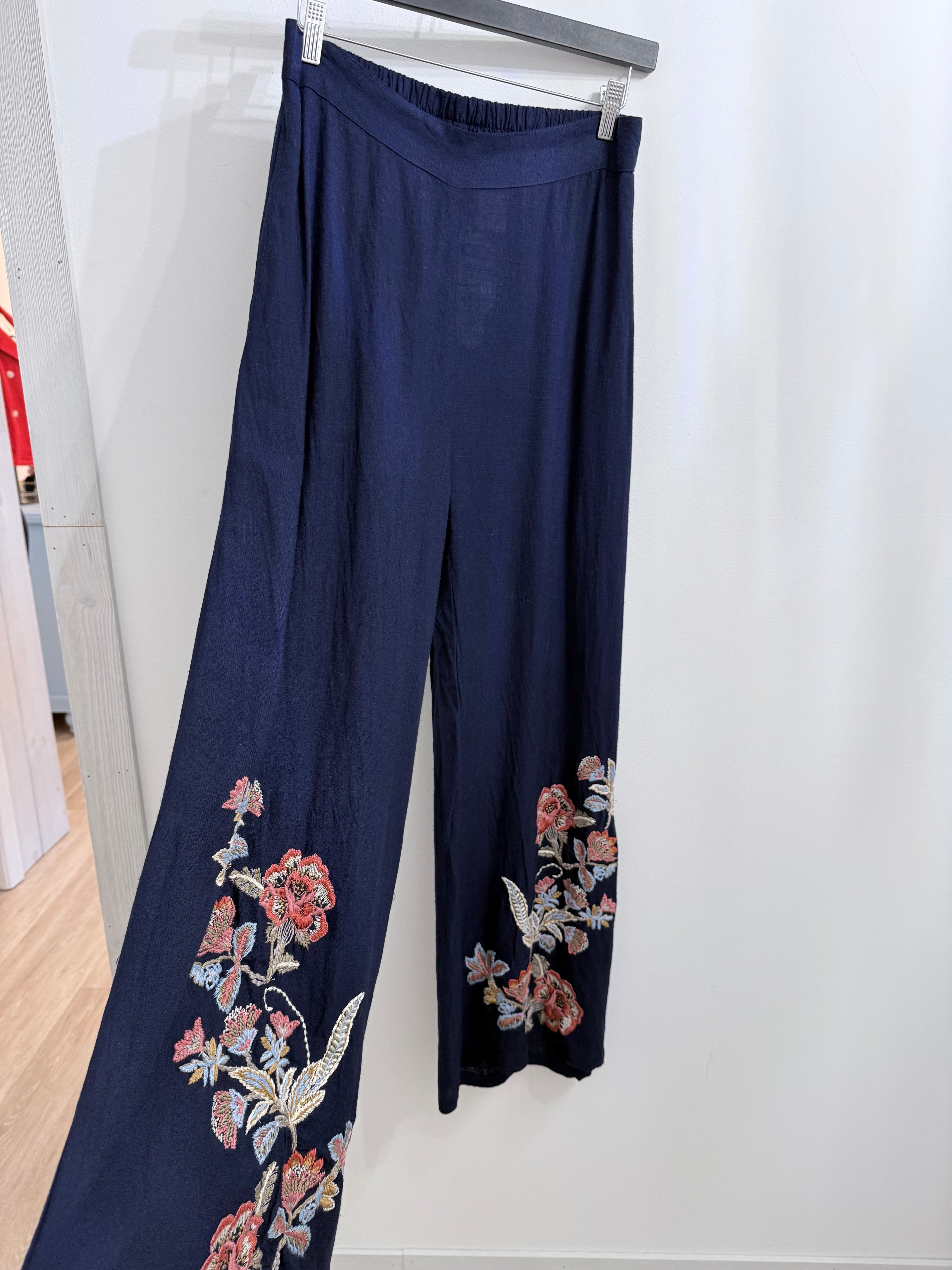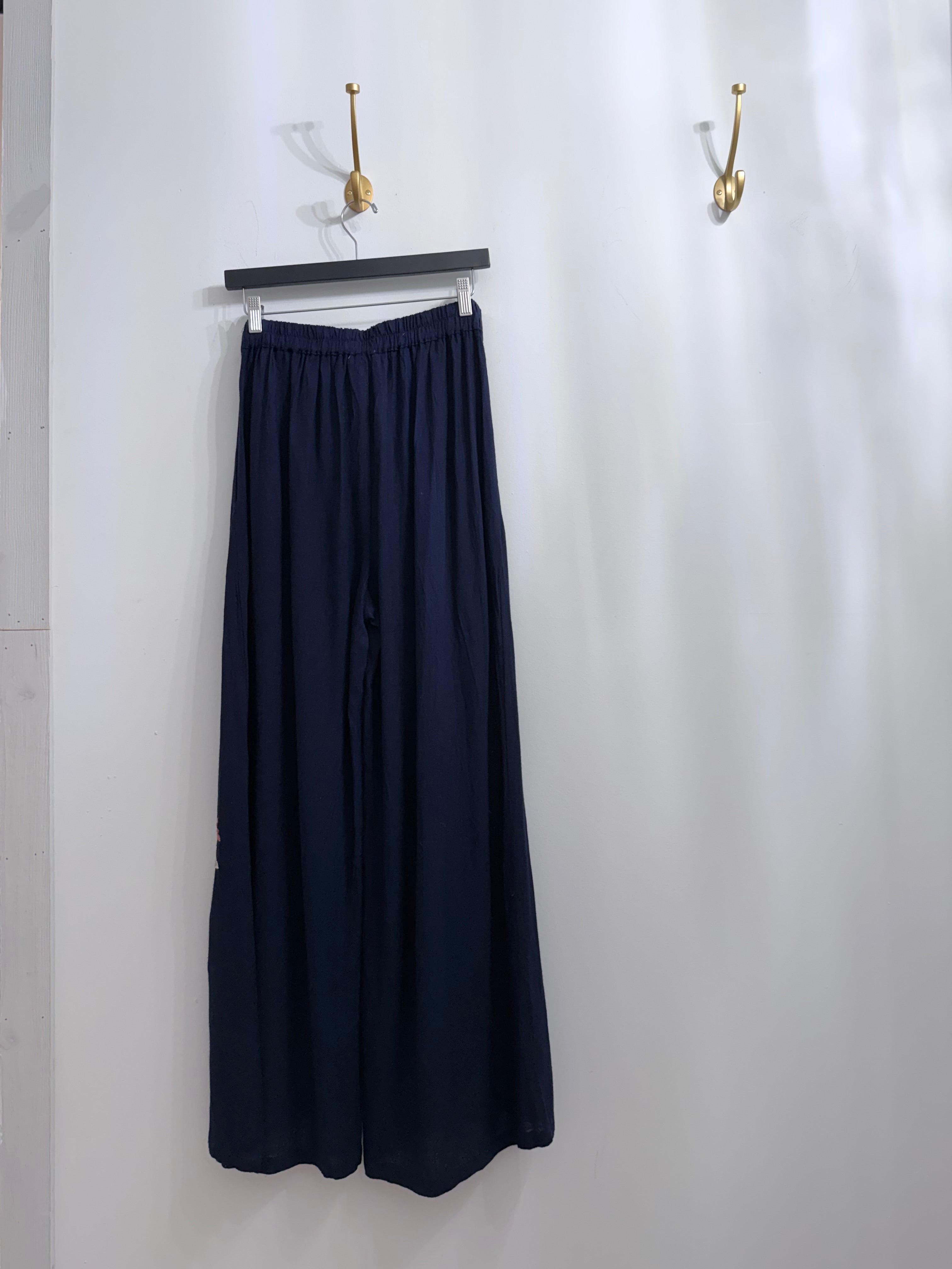 Escape to coastal bliss in these navy blue, floral linen/cotton blend embroidered pants—your new vacation essential. Crafted from breathable linen and cotton blend with charming floral-inspired details, they're designed for lazy beach days and waterfront wandering. Pair them with your favorite tank or linen shirt for effortless beachside style that feels as good as it looks. Whether you're strolling the boardwalk or settling in for sunset, these pants bring relaxed elegance to every getaway moment.